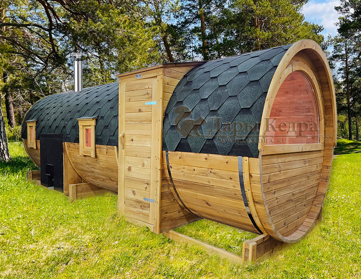 • Баня-бочка «Пентагон» с боковым входом и панорамным окном Стильная и современная баня-бочка с боковым входом может быть выполнена длиною от 4 метров, с двумя отделениями (парилка и комната отдыха). Полок может быть, как с двух сторон, так и угловой, в стандарте двухуровневый. Печь в данной модели расположена сбоку с топкой внутрь парилки, либо наружу или в соседнее помещение. Печь можно укомплектовать баком для воды, а саму баню сделать длиною до 6 метров, комфортно разместив в ней дополнительно помывочную. В эту модель включено одно закаленное квадратное стекло в комнате отдыха. Обращаем Ваше внимание, по умолчанию в данной модели отсутствует бак для воды, вместо него идёт утеплённая термо-труба, которую можно заменить на бак по желанию.