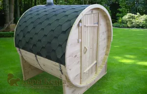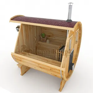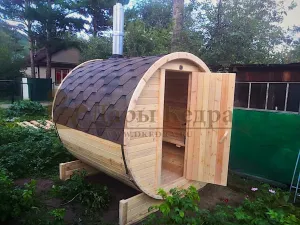 Это изделие круглой вытянутой формы с одним парильным отделением. Внутреннее пространство включает в себя печь у дальней стены и лавки из кедра по обе стороны бани. За счет компактной формы баня нагревается в течение 30 минут. По вашему желанию ее можно укомплектовать козырьком, верандой и печью с внешней загрузкой, благодаря которой весь мусор после топки остается на улице. Круглая баня-бочка не требует полноценный фундамент, поэтому при необходимости ее можно перенести в другое место.