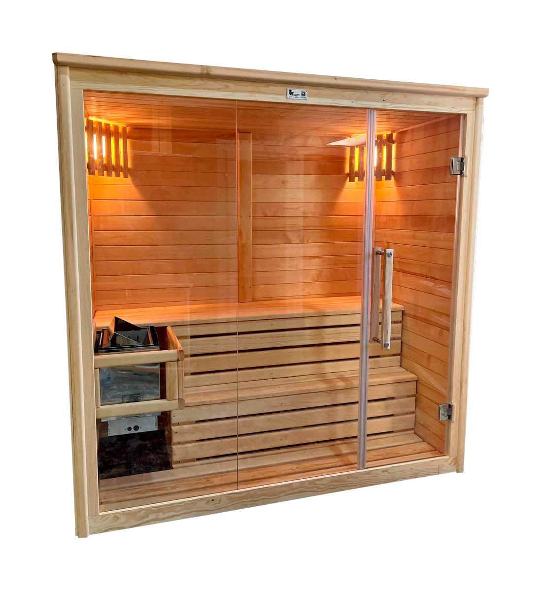 Трехместная прямая финская «Элит» сауна кабина из кедра и липы с электрокаменкой Это специально оборудованная готовая деревянная кабина для сухого и влажного парения. Электропечь нагревает пространство внутри и позволяет сбрызгивать камни водой, слегка увлажняя воздух. Такая процедура позволяет избежать перегрева. Каркас сауны выполнен из массива кедра, снаружи и внутри обшит липовой вагонкой сорта «Экстра» и имеет теплоизоляционный слой. Также двухуровневый полок идёт из кедра для обогащения внутри кабины полезными фитонцидами, а в сочетании с противовирусными свойствами липы сауна становится настоящим источником здоровья. Закаленный цельностеклянный фасад с безрамной дверью является термостойким и придает конструкции легкость и обзорность. Можно добавить боковую стенку, как на образце 3D модели из термостекла за дополнительную плату. Дополнив кабину панелью из гималайской соли или можжевеловым панно с подсветкой вы получаете красивейший объект в интерьере. Финская сауна с электропечью подойдет, как для домашнего использования, так и для коммерции. Доставляется в разборном виде щитами, собирается по инструкции с помощью шуруповёрта.